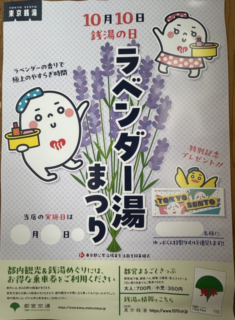 10/10(日) ラベンダー湯まつり2025年09月06日(土) 10月10日銭湯の日に、ラベンダー湯まつりを開催します。 この日は特別記念としてゆっポくん特製タオルを進呈します。 この機会にぜひお越しください。 ※10月10日が休業日の銭湯の場合、10月9日(土)に実施します。