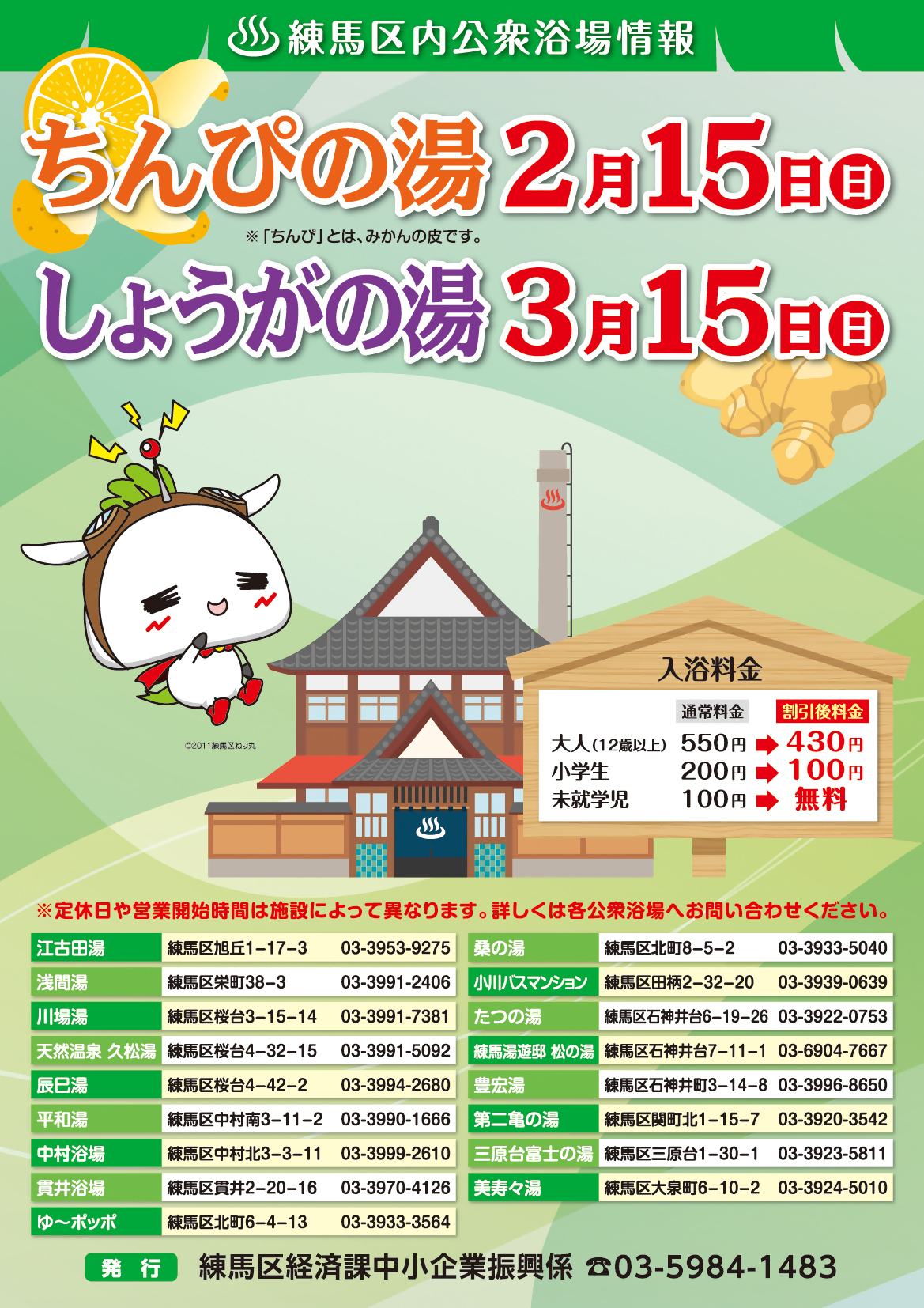 2/15(日) ちんぴの湯、3/15(日) しょうがの湯(割引料金)2026年02月13日(金) 2/15(日)にちんぴの湯🍊 3/15(日)にしょうがの湯🫚 を実施いたします。 両日とも割引料金でご利用いただけます。