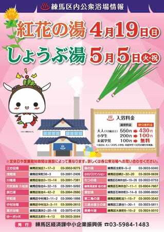 4/19(日) 紅花の湯、5/5(火祝) しょうぶ湯2026年04月12日(日) 4月19日(日) 紅花の湯 割引料金でご入浴いただけます。 5/5(火 祝日) しょうぶ湯 割引料金でご入浴いただけます。 当日休業の浴場は前後します。